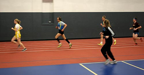 The first event was the 60 meter dash. No thanks. I just kept warming up and watched a few heats go off: