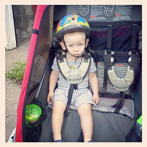 "Loaded up to go watch Momma race!"That's Henry in the bike stroller - notice he's already positioned his "munch cup" and his water cup on either side. We just had a short 5.5 mile ride from our house to the Stone Arch Bridge in Minneapolis where the race was finishing.