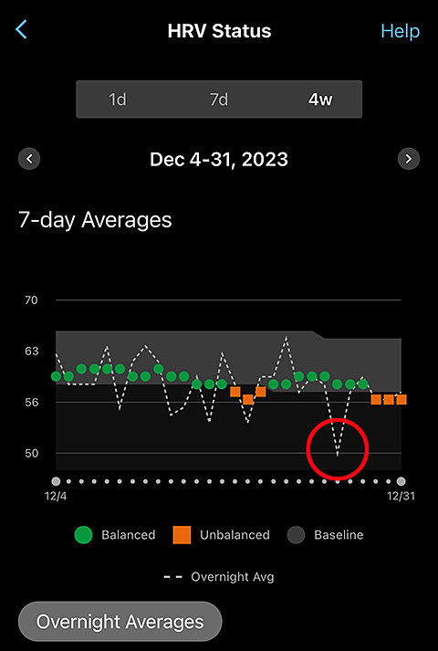 Oh, and I noticed a funny thing regarding the car accident back in December in my Garmin data. The night of the crash, stress, guilt, worry, or something got to me, as an HRV status of 50 is the lowest I've ever recorded: